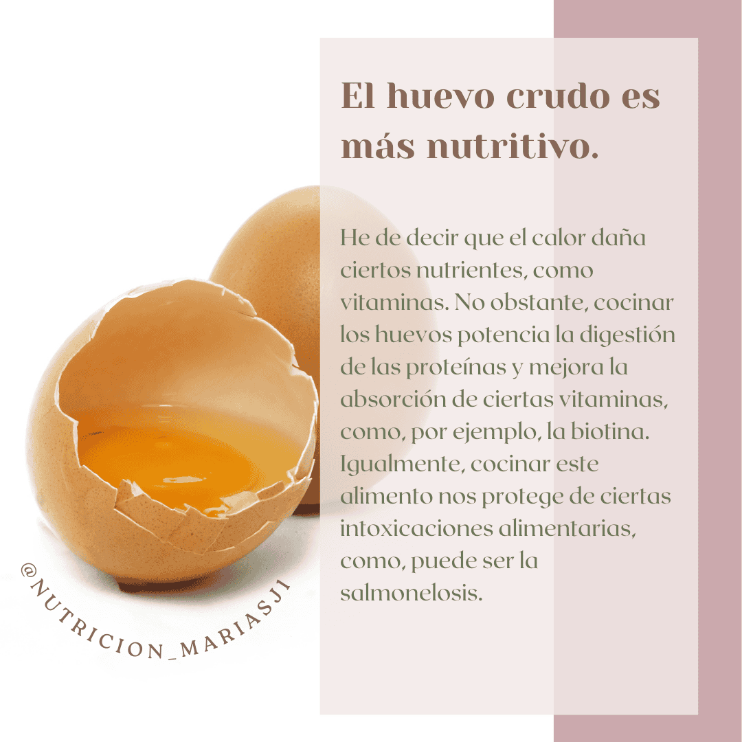He de decir que el calor daña ciertos nutrientes, como vitaminas. No obstante, cocinar los huevos potencia la digestión de las proteínas y mejora la absorción de ciertas vitaminas, como, por ejemplo, la biotina.