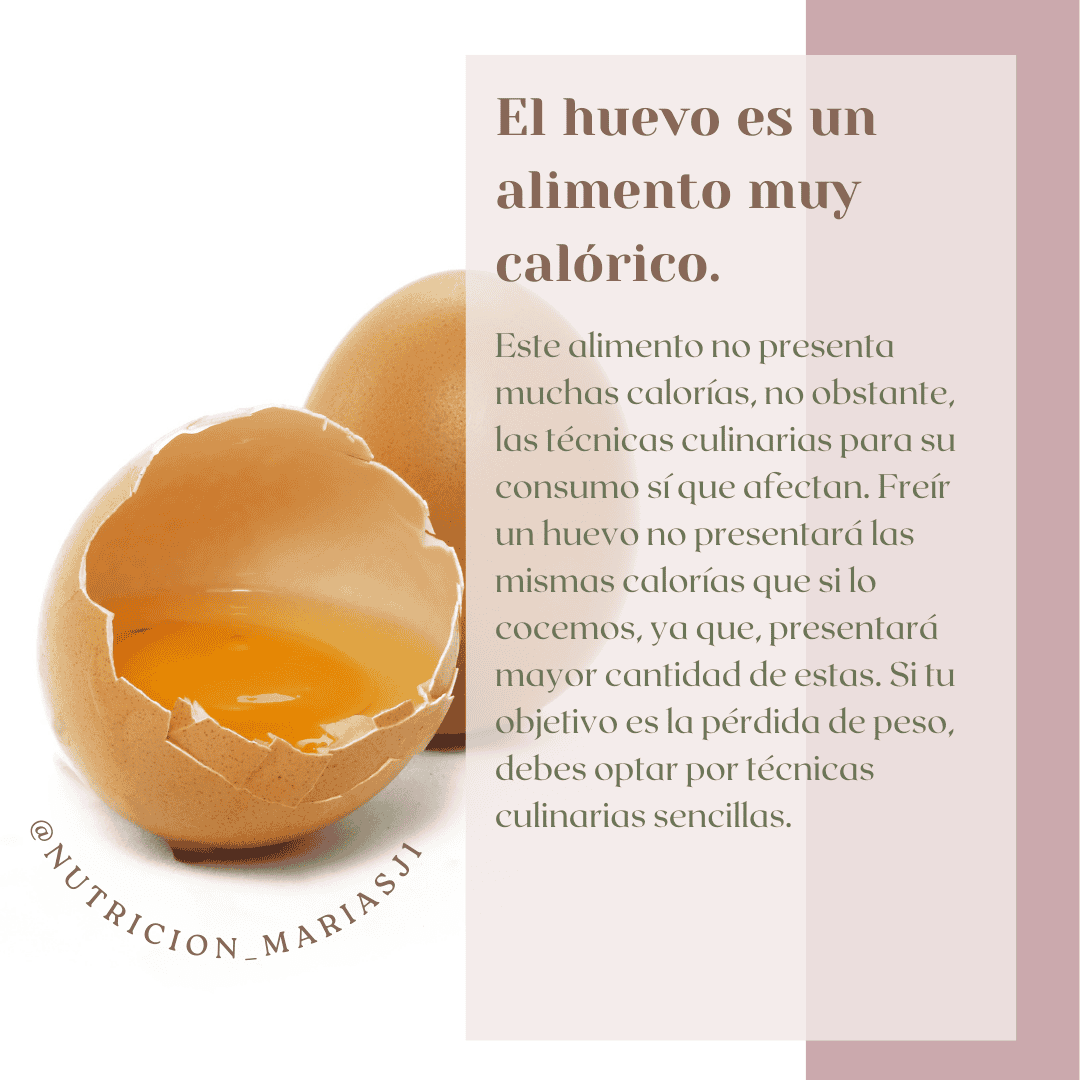 Este alimento no presenta muchas calorías, no obstante, las técnicas culinarias para su consumo sí que afectan. Freír un huevo no presentará las mismas calorías que si lo cocemos, ya que, presentará una mayor cantidad de estas. Si tu objetivo es la pérdida de peso, debes optar por cocinados sencillos.