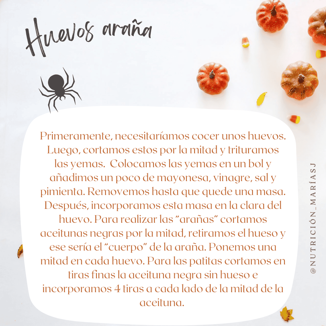 Primeramente, necesitaríamos cocer unos huevos. Luego, cortamos estos por la mitad y trituramos las yemas. Colocamos las yemas en un bol y añadimos un poco de mayonesa, vinagre, sal y pimienta. Removemos hasta que quede una masa. Después, incorporamos esta masa en la clara del huevo. Para realizar las “arañas” cortamos aceitunas negras por la mitad, retiramos el hueso y ese sería el “cuerpo” de la araña. Ponemos una mitad en cada huevo. Para las patitas cortamos en tiras finas la aceituna negra sin hueso e incorporamos 4 tiras a cada lado de la mitad de la aceituna.