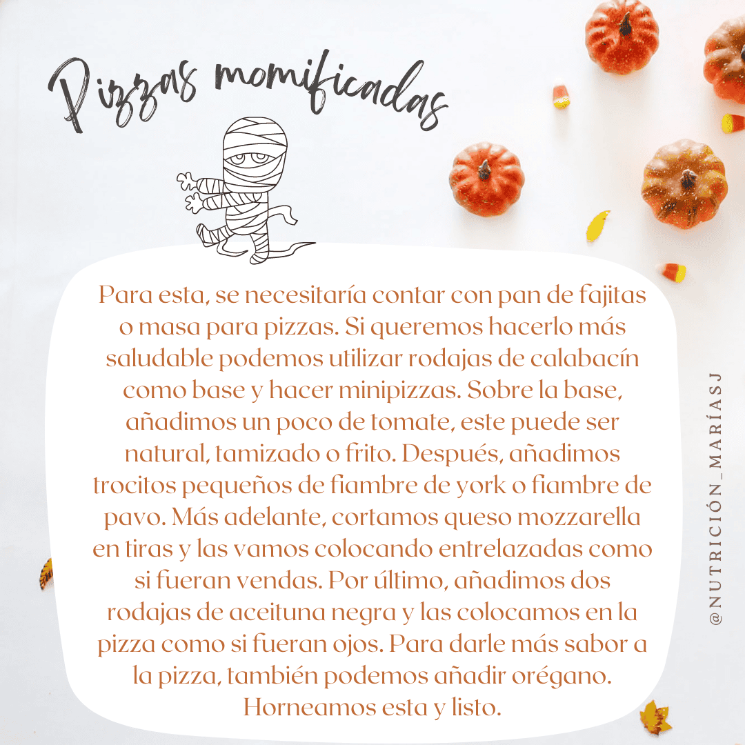 Para esta, se necesitaría contar con pan de fajitas o masa para pizzas. Si queremos hacerlo más saludable podemos utilizar rodajas de calabacín como base y hacer minipizzas. Sobre la base, añadimos un poco de tomate, este puede ser natural, tamizado o frito. Después, añadimos trocitos pequeños de fiambre de york o fiambre de pavo. Más adelante, cortamos queso mozzarella en tiras y las vamos colocando entrelazadas como si fueran vendas. Por último, añadimos dos rodajas de aceituna negra y las colocamos en la pizza como si fueran ojos. Para darle más sabor a la pizza, también podemos añadir orégano. Horneamos esta y listo.