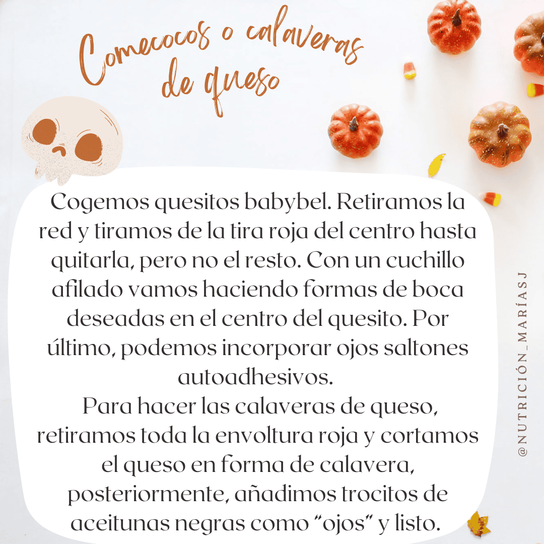 Cogemos quesitos babybel. Retiramos la red y tiramos de la tira roja del centro hasta quitarla, pero no el resto. Con un cuchillo afilado vamos haciendo formas de boca deseadas en el centro del quesito. Por último, podemos incorporar ojos saltones autoadhesivos.Para hacer las calaveras de queso, retiramos toda la envoltura roja y cortamos el queso en forma de calavera, posteriormente, añadimos trocitos de aceitunas negras como “ojos” y listo.